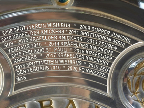 Meister: 1. FC Krizzzz-Mas 1593 Punkte, 2. Spottverein Wishibus 1365 Punkte, 3. Kräfelder Knickers 1330 Punkte